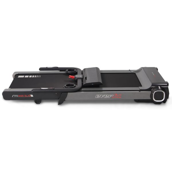 Moderní běžecký pás EVERFIT TFK 655 SLIM je skvělou volbou pro všechny sportovce, kteří se chtějí zaměřit na pravidelný kondiční trénink v domácím prostředí. Trenažér je vybaven komfortní běžeckou plochou o rozměrech 132 x 46 cm s kvalitním odpružením, elektronickou regulací stoupání v rozmezí 0-12% a elektromotorem s trvalým výkonem 2,5 PS. Pět bíle podsvícených LED displejů přehledně informuje o všech měřených hodnotách. K dispozici je celkem 20 tréninkových programů, včetně 3 HRC módů a 3 uživatelsky konfigurovatelných profilů. Velkou výhodou je možnost složení pásu do kompaktních rozměrů – po sklopení se pás pohodlně vejde například pod gauč nebo za skříň.