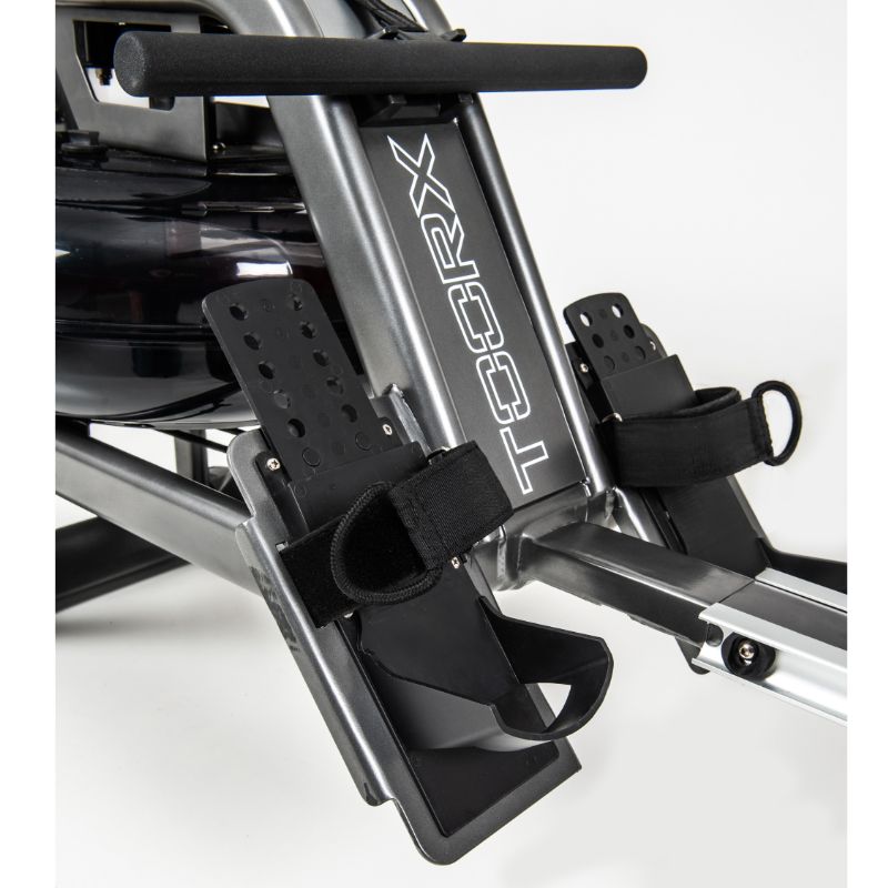 Veslovací trenažér TOORX ROWER SEA pracuje na principu vodního odporu. Tréninková zátěž se určuje přiléváním a vyléváním vody z nádrže s lopatkami. Zvuk vody při každém záběru tak přináší příjemný pocit a realistický zážitek, stejný jako při klasickém veslovaní na vodě. Přehledný displej zobrazuje všechny důležité tréninkové hodnoty a pro  zpestření tréninku nabízí program Race a funkci Recovery, díky které si můžete otestovat vlastní kondici. Uživatelé jistě ocení také pohodlné sedlo, nastavitelnou délku opěrek na nohy nebo transportní kolečka pro snazší manipulaci. Díky praktickému mechanismu "překlopení" pro lepší uskladnění i v menších prostorech je veslovací trenažér TOORX ROWER SEA skvělým nástrojem do domácí posilovny.