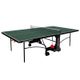 vnitřní stůl, sklopitelný, zelená hrací plocha s antireflexním povrchem, 4 zdvojená transportní kolečka, 2 otočná o 360°, síťka součástí stolu, držák na pálky a míčky, bezpečný mechanismus sklopení stolu, hmotnost 75 kg, zelená – černá